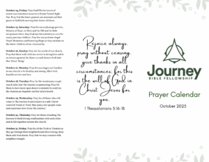 We are called to pray for one another! Our monthly prayer guide provides a daily prayer request for you to include in your prayer life. Thank you for praying for the Journey!